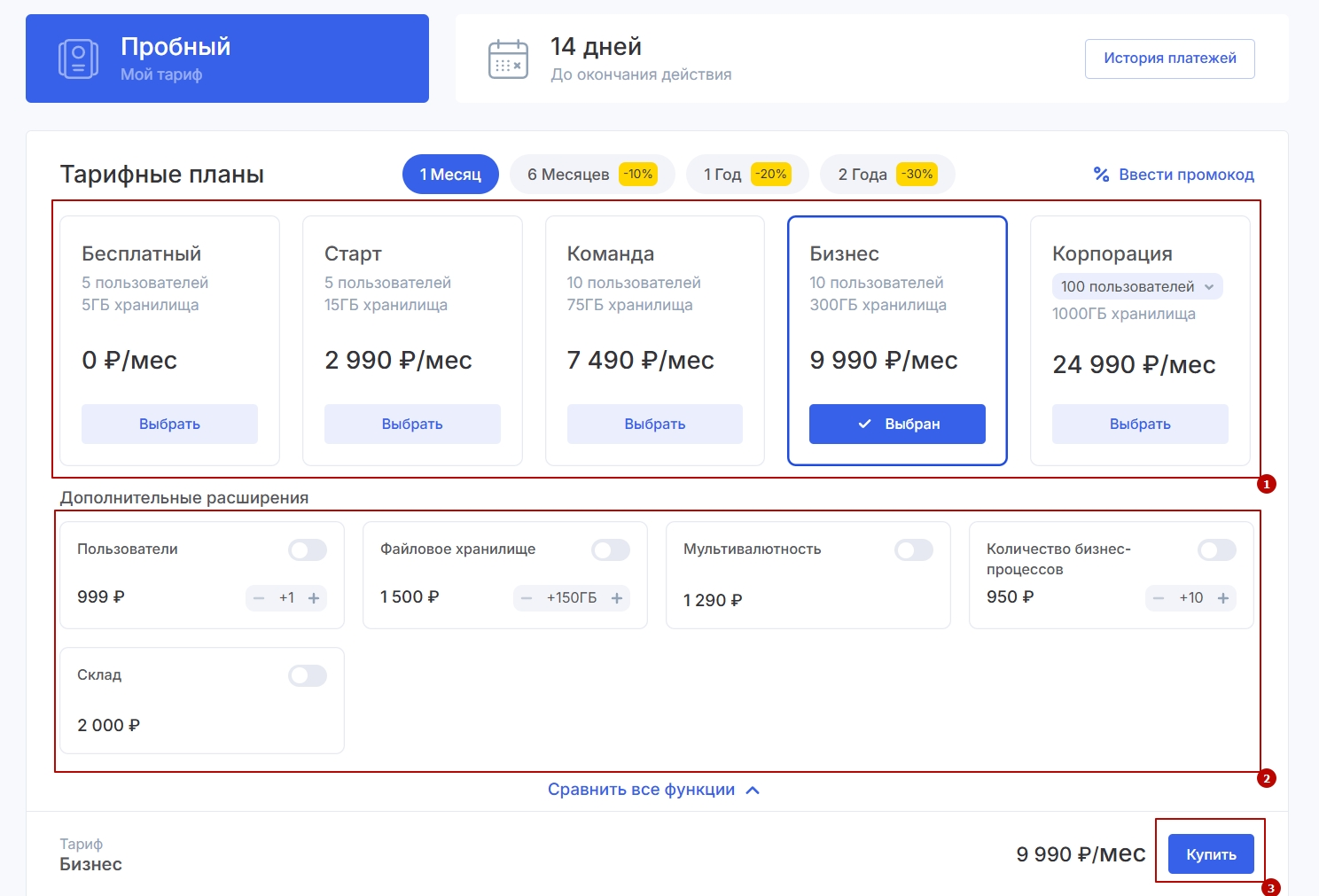 - Перейдите к оплате — для этого нажмите кнопку «Купить» (3)