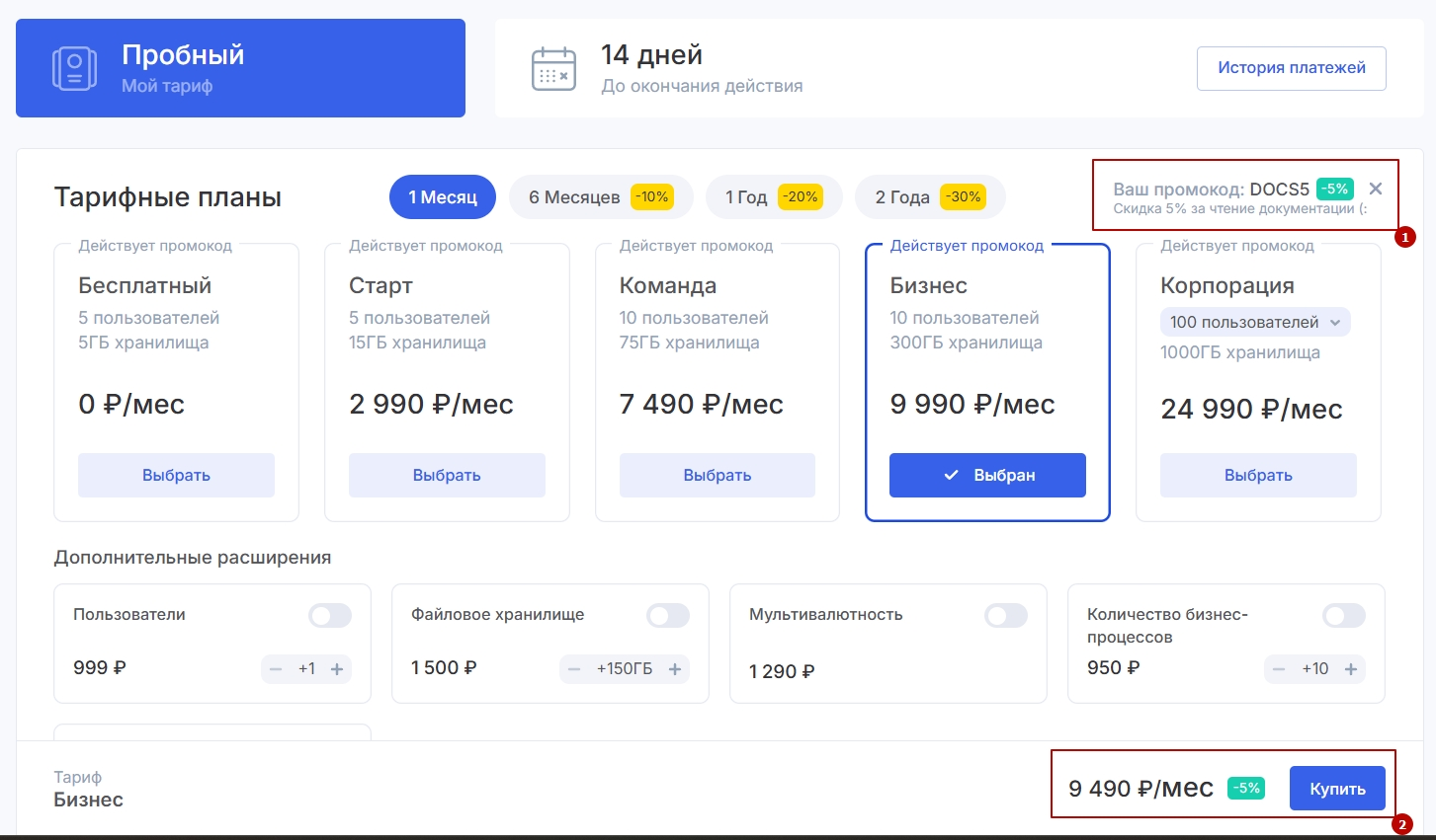 4) В случае активности промокода вы увидите его описание (1), а цена изменится с учетом скидки (2).
