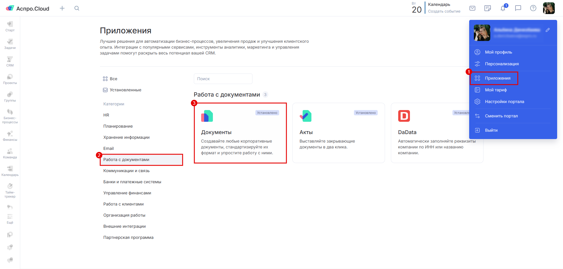 Перейдите в «Приложения» (1) → «Работа с документами» (2) или воспользуйтесь поиском.