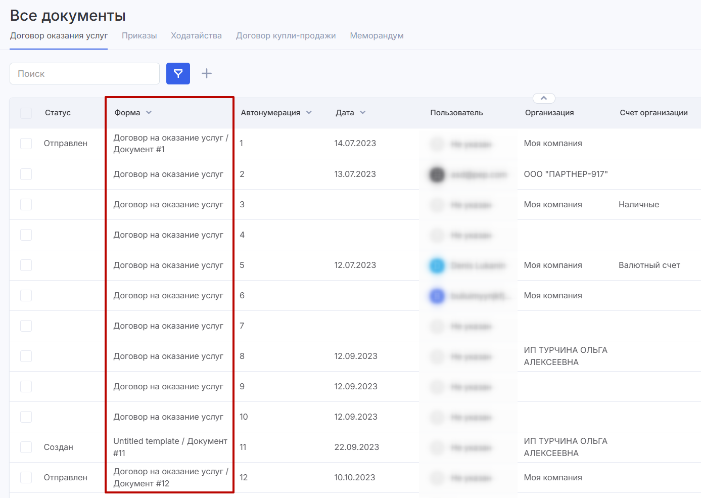 Печатные формы также отображаются отдельной колонкой в списке документов — так вы узнаете, из какого шаблона был создан конкретный документ.