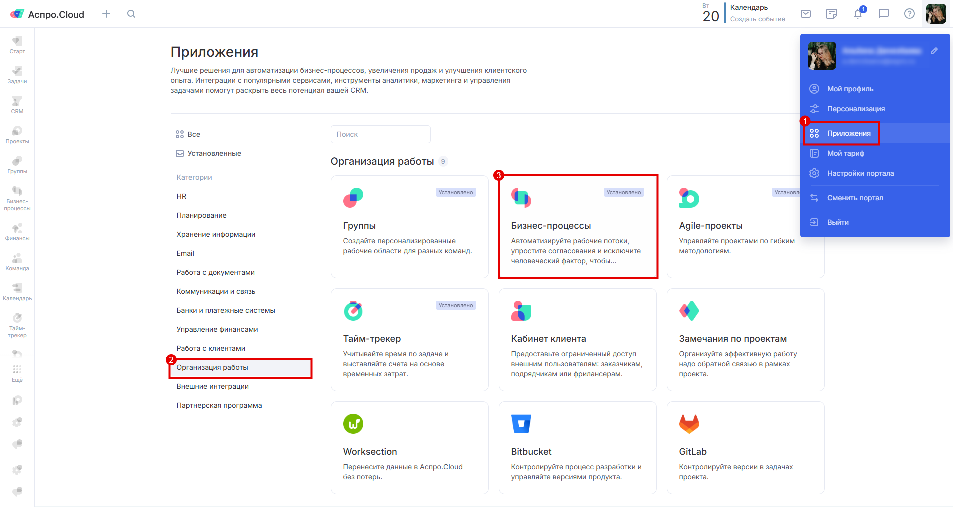 Перейдите в «Приложения» (1) → «Организация работы» (2) или воспользуйтесь поиском.