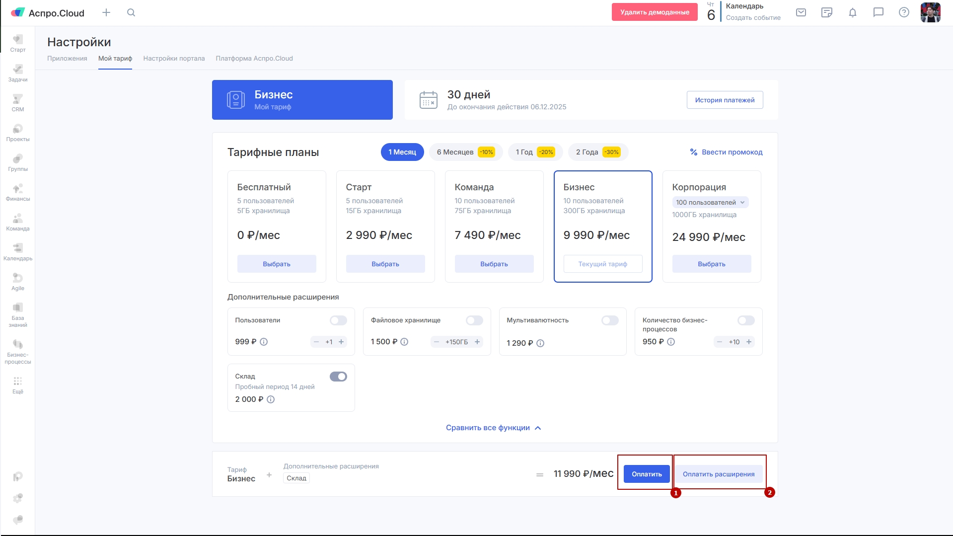 В нижней части окна располагаются две кнопки оплаты. Кнопка «Оплатить» (1) позволит приобрести расширение вместе с тарифом. Кнопка «Оплатить расширение» (2) позволит приобрести только расширения на срок вашей активной подписки.