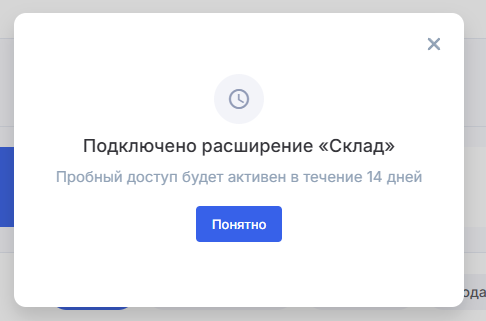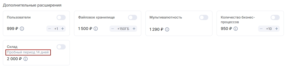 К доступным расширениям «Складского учета» и «Отчета P&L» (Прибыль и убытки) мы предлагаем пробный период, который продлится 14 дней. Это позволит познакомиться с функциональностью данных модулей и сформировать понимание их ценности для вас.