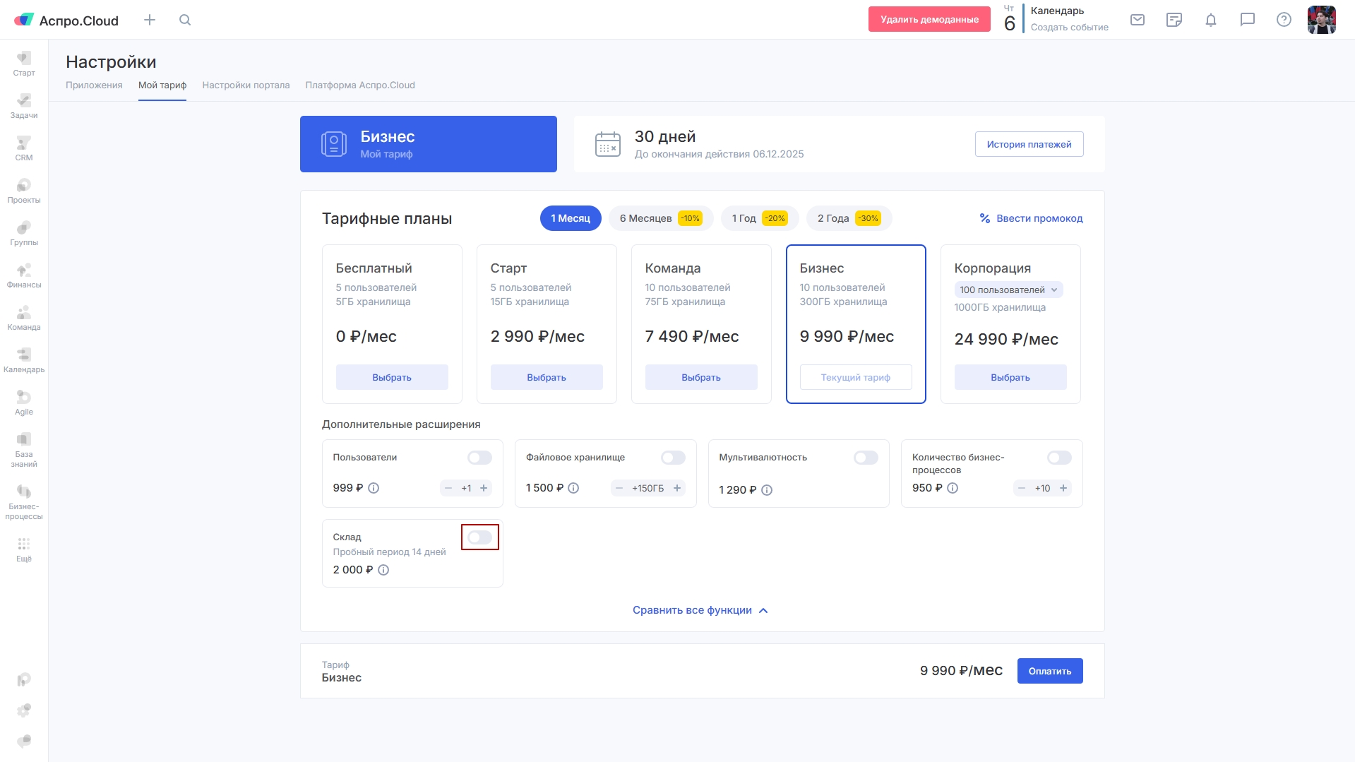 Вы хотите подключить «Складской учет» на тарифе «Бизнес». Расширение стоит 2 000 ₽ за месяц. Рассмотрим несколько ситуаций: