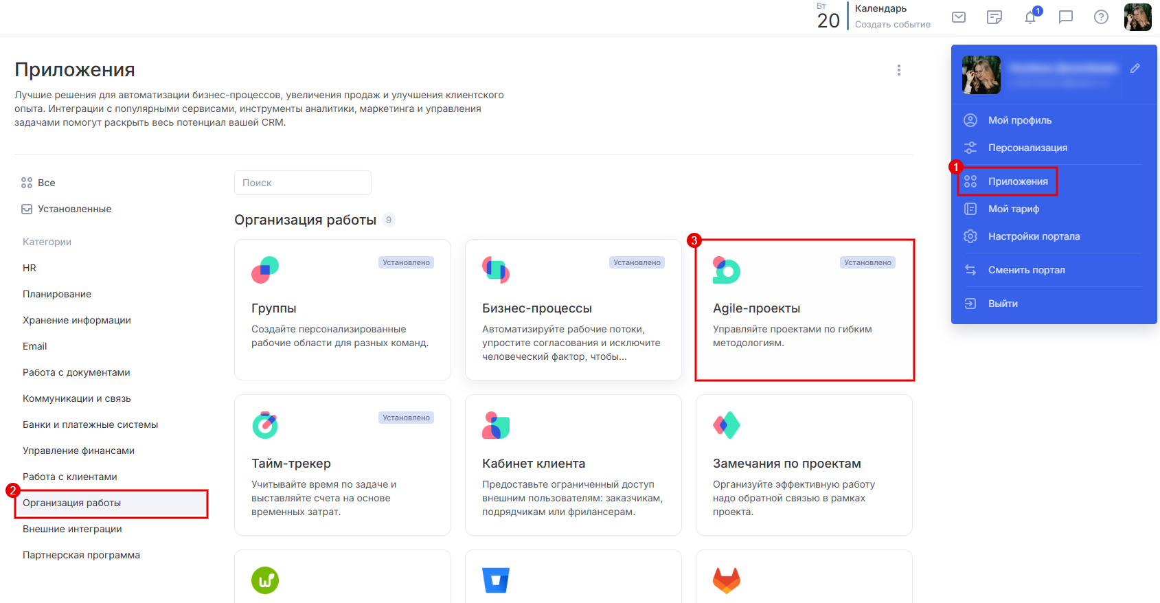 В списке приложений найдите «Agile-проекты» (3) и кликните на него.