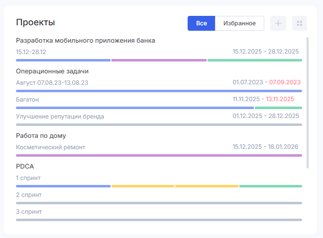 Этот виджет показывает все актуальные Agile-проекты и отображает их этапы, периоды спринтов и количество задач.