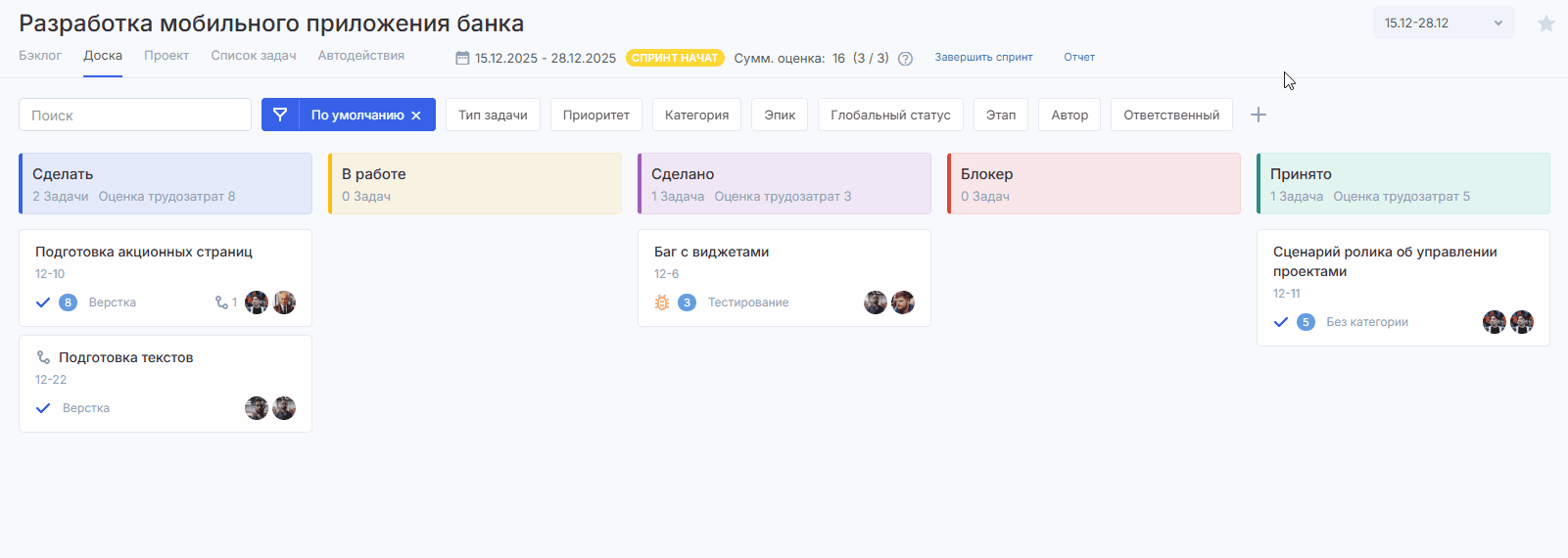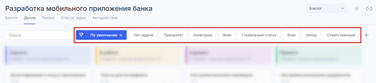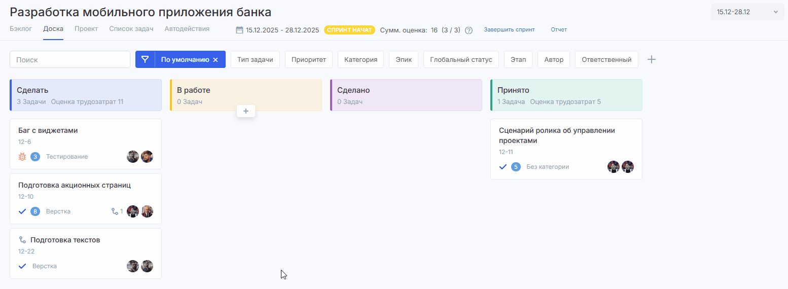 Доска — это основной элемент Agile-модуля. Это место, где происходит непосредственная работа над вашими проектами.