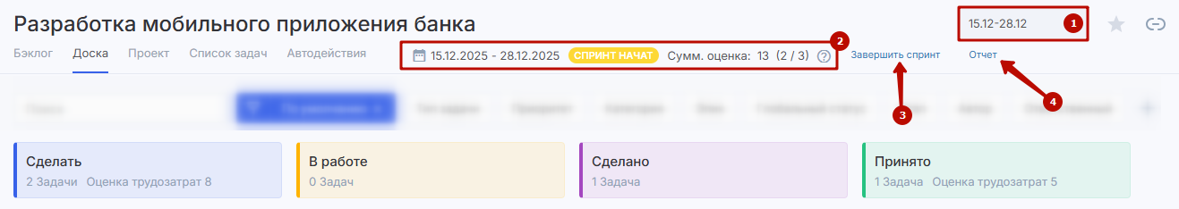 При переключении доски на спринт (1) в верхней панели интерфейса появится строка с краткой информацией о спринте (2) — даты, статус и суммарная оценка. Здесь же вы сможете завершить или начать (3) спринт, а также перейти к диаграмме сгорания задач (4).