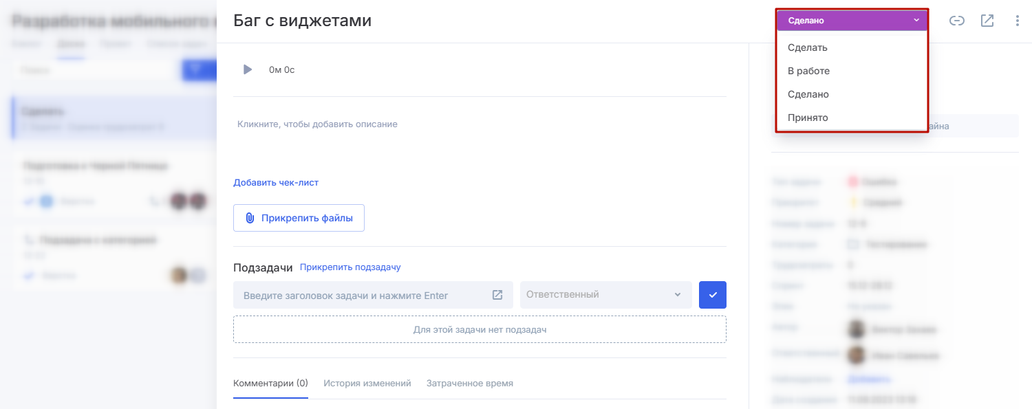 Изменять статус задач можно также из их детальной страницы — через соответствующий селектор.