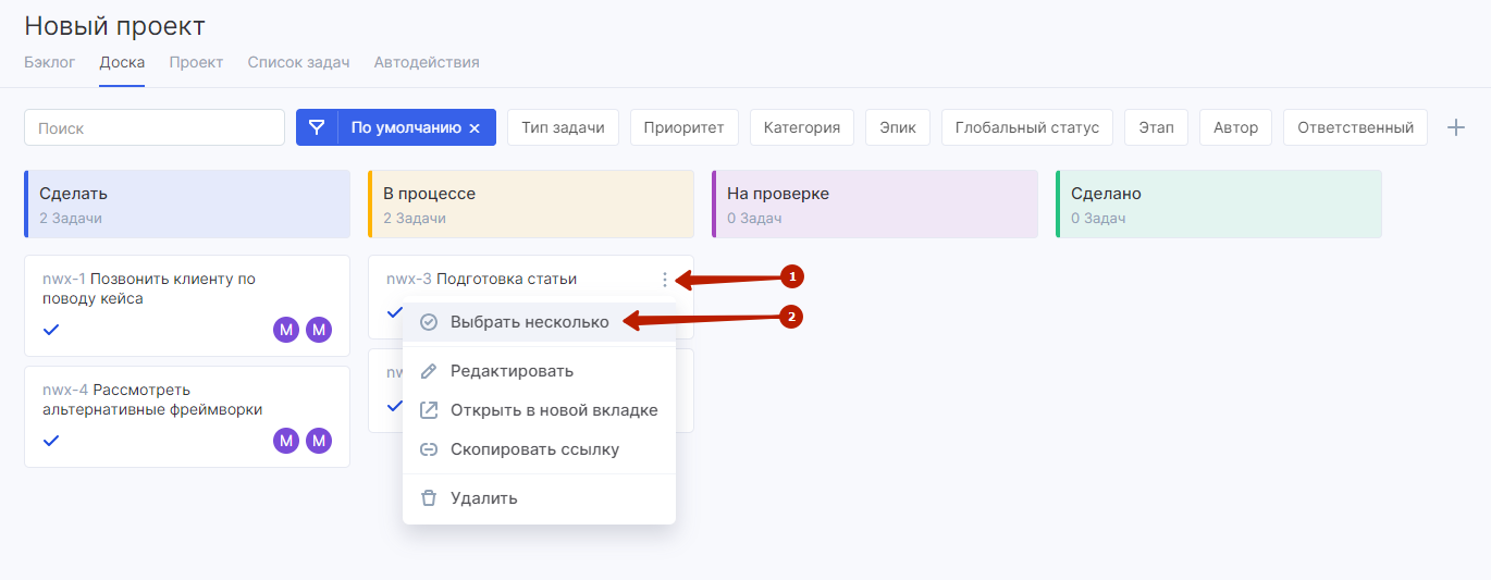 Чтобы выбрать несколько задач, наведите курсор на любую из них и откройте контекстное меню (1), а затем выберите пункт «Выбрать несколько» (2).