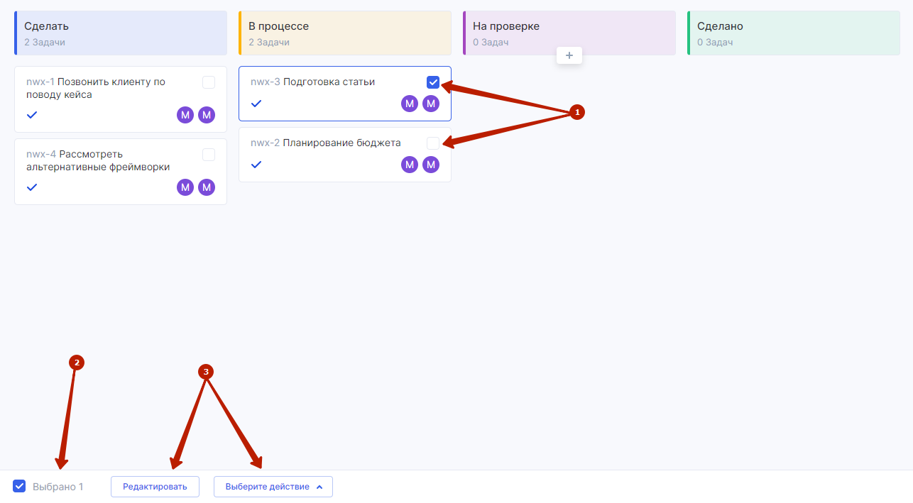 В карточках всех задач на доске появятся чекбоксы — отметьте нужные задачи галками в этих чекбоксах (1). В нижней части доски также появится панель с счетчиком выбранных задач (2) и кнопками возможных действий (3).