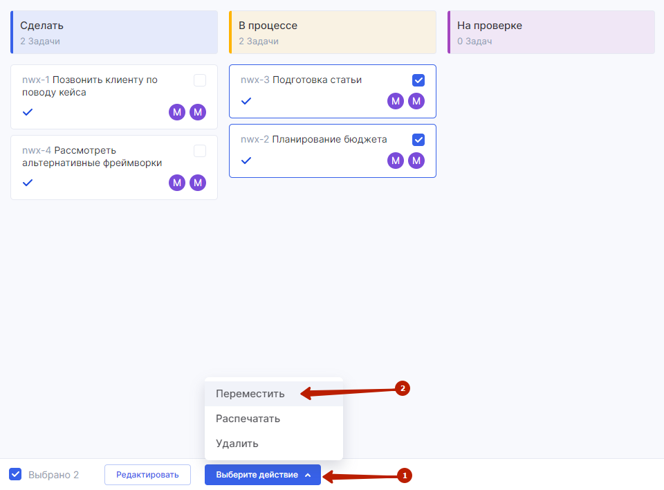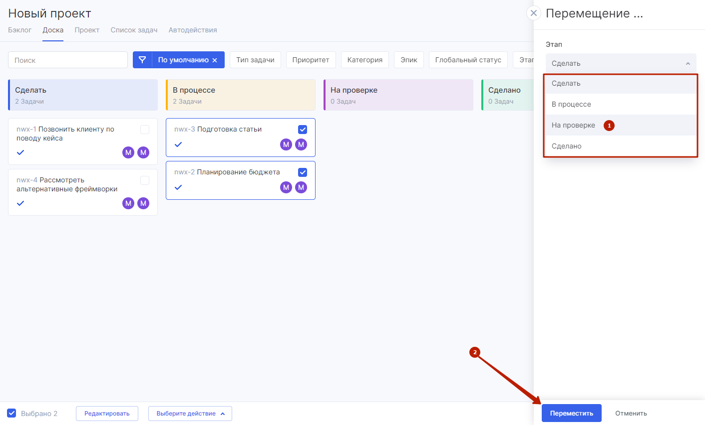 Чтобы переместить выбранные задачи на другой этап, нажмите кнопку «Выбрать действие» (1) и выберите пункт «Переместить» (2).