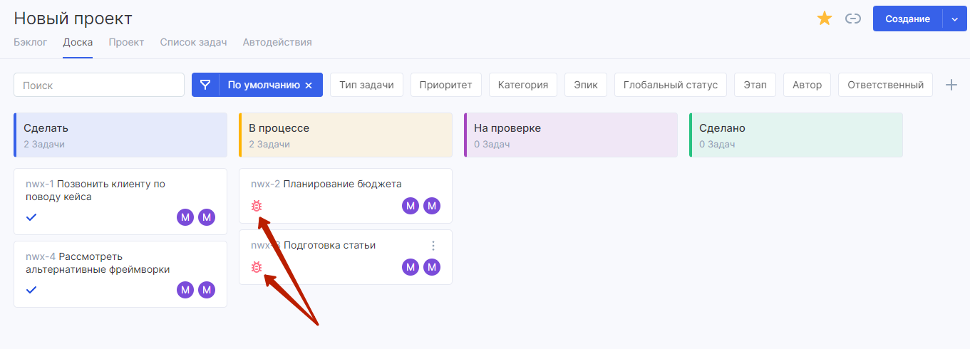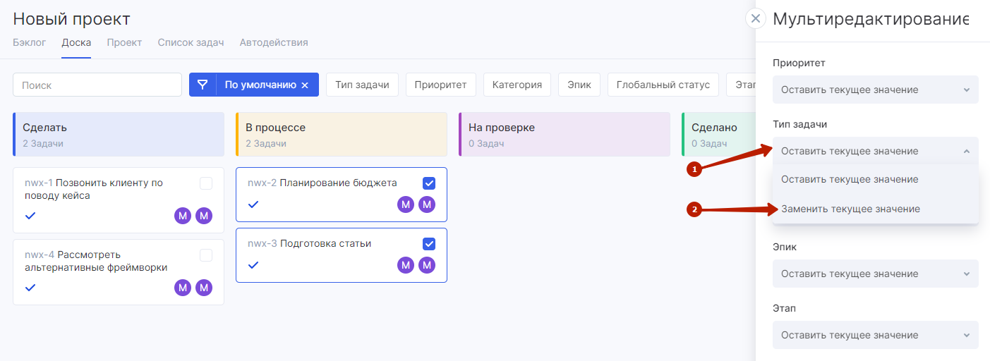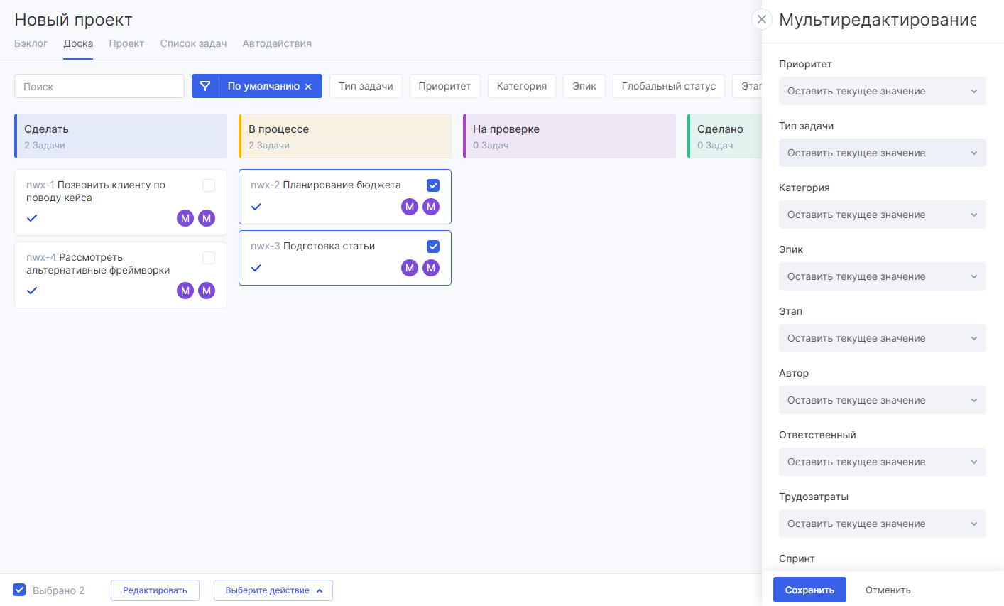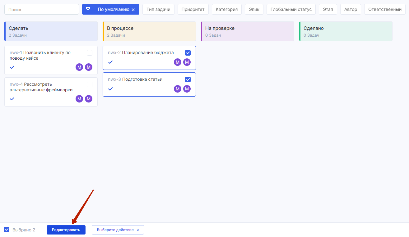 Мультивыбор — возможность отметить на доске сразу несколько задач. С помощью мультивыбора вы можете совершить какое-либо действие со всеми выбранными задачами одновременно. Например: