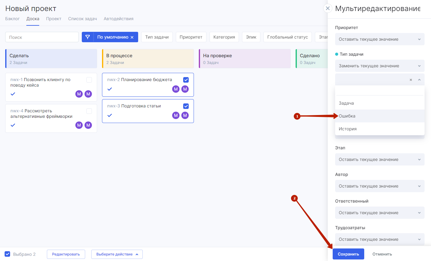 Готово. Так всего в несколько кликов вы сможете редактировать сразу несколько задач. Например, поменять тип задач.