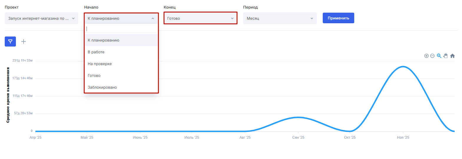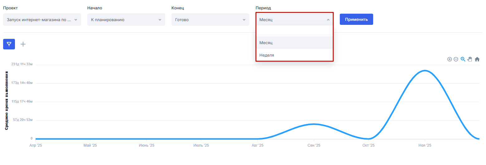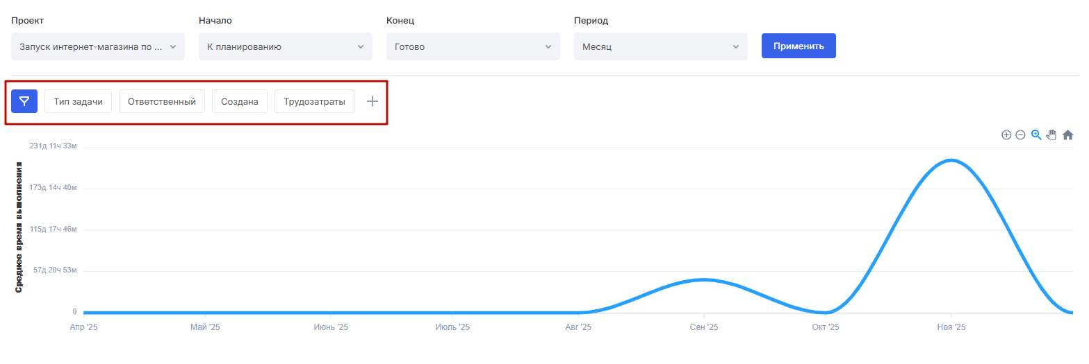 Задачи, данные по циклам которых вы хотите получить, можно также фильтровать — по типу, ответственному, трудозатратам и другим параметрам.