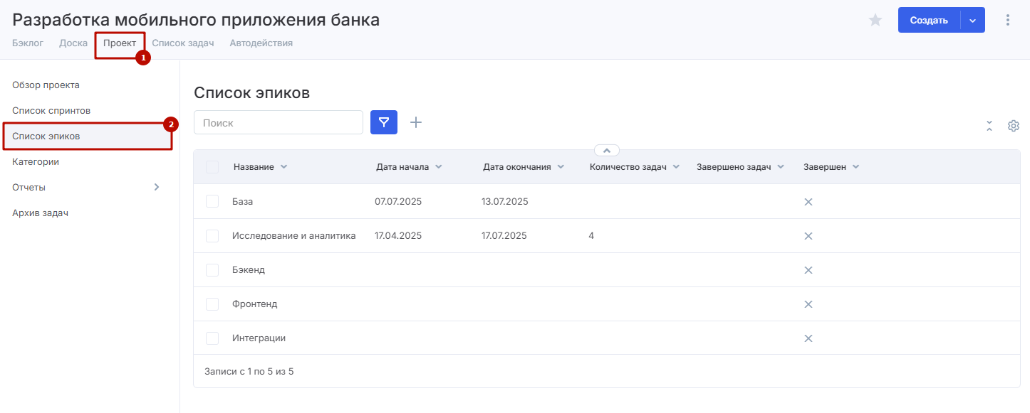 Со списком всех созданных эпиков можно ознакомиться во вкладке «Проект» (1) — в подразделе «Список эпиков» (2).