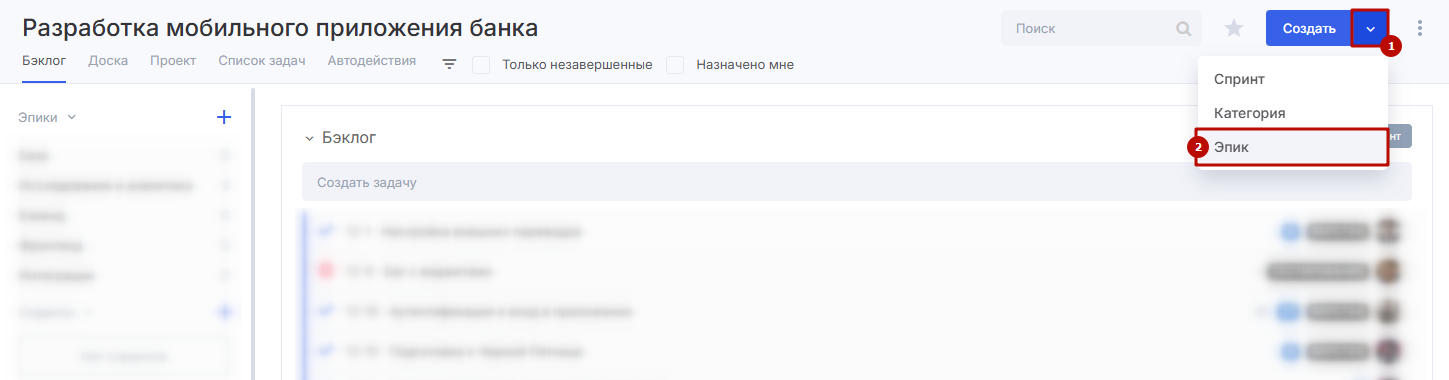 Создать эпик можно на любой странице проекта (кроме раздела «Автодействия») с помощью стрелки рядом с кнопкой «Создать» (1) — в выпадающем меню выберите пункт «Эпик» (2).