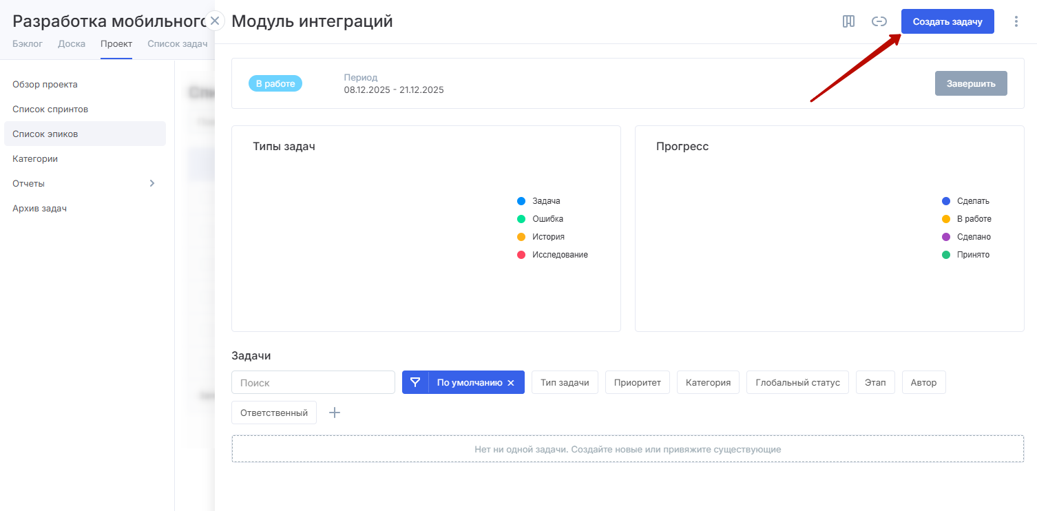 Готово — эпик создан. Теперь в него можно добавить задачи.