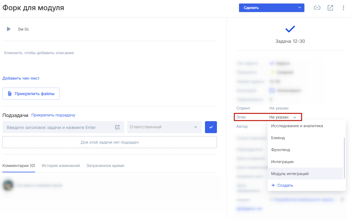 В эпики можно добавлять уже существующие задачи. Например, из бэклога или доски. Просто откройте конкретную задачу и выберите нужный эпик через селектор в соответствующем поле.