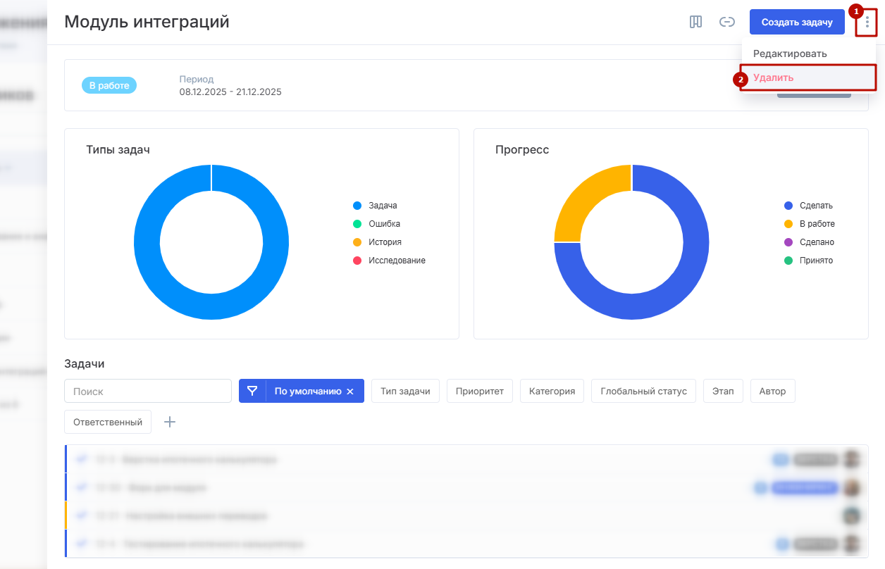 В списке эпиков откройте нужный. Откройте контекстное меню (1) в правом верхнем углу и выберите пункт «Удалить» (2).