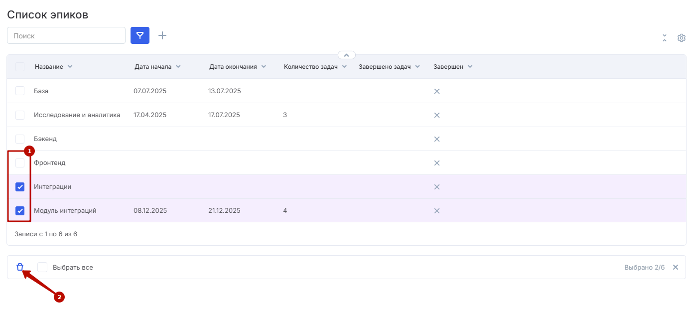 В списке эпиков отметьте галками чекбоксы (1) тех эпиков, которые хотите удалить. Затем нажмите на иконку удаления (2) в нижней части списка.