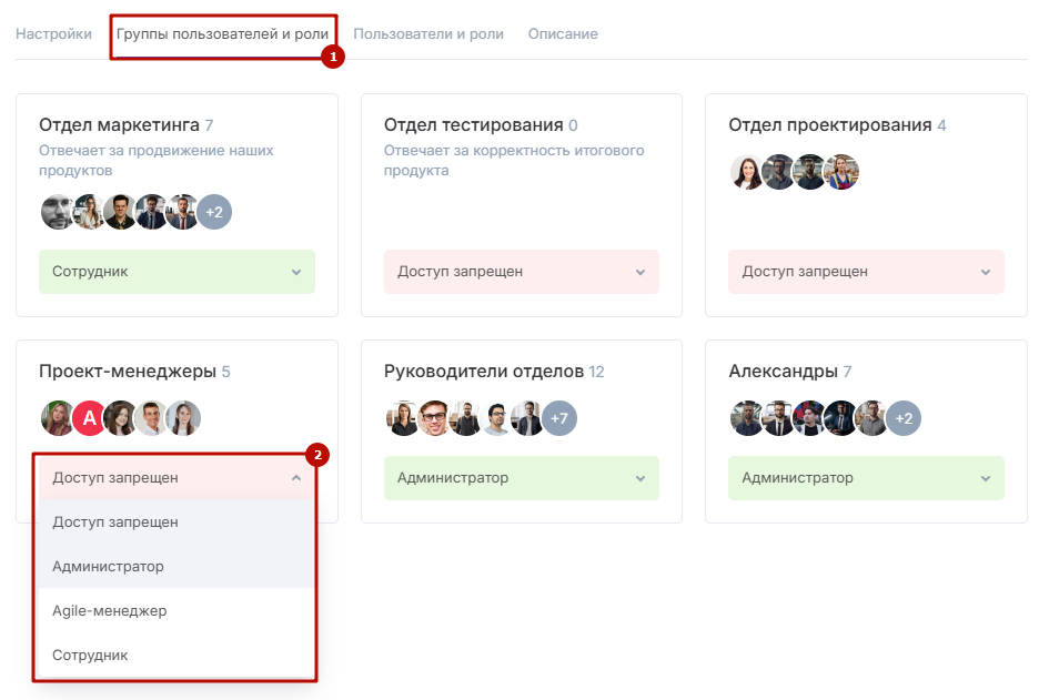 Если вы хотите изменить права сразу для целой группы пользователей, во вкладке «Группы пользователей и роли» (1) выберите нужную группу и через выпадающий список установите ее уровень доступа (2).