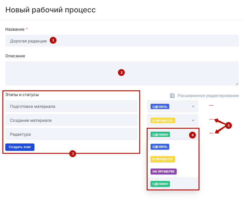 При создании и настройке этапов вы также можете перейти в режим расширенного редактирования рабочего процесса.