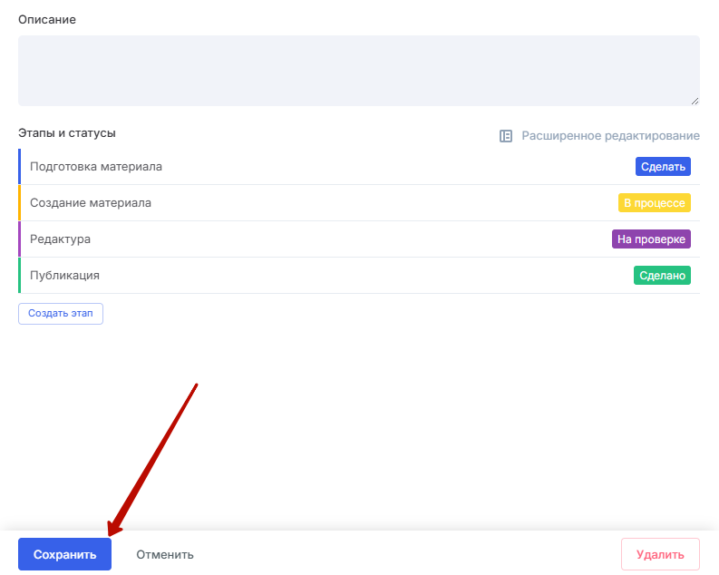 В своем рабочем процессе вы можете создать любое количество этапов с любыми статусами. Минимум — 2 (со статусами «Сделать» и «Сделано»). Так вы сможете предусмотреть все этапы подготовки, проверок и внесения правок в соответствии с вашим стилем работы.
