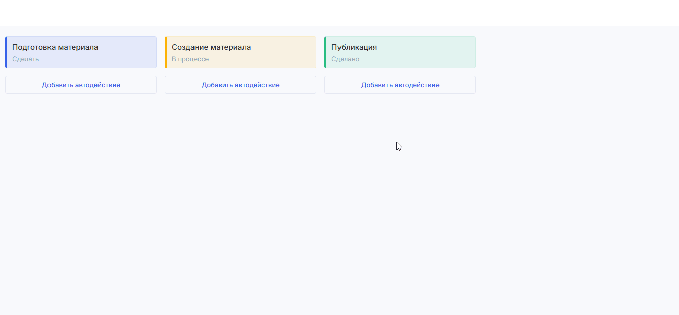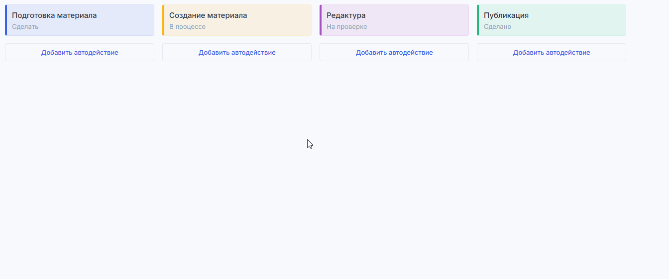 В этом режиме рабочий процесс будет визуализирован, как на доске задач. Для добавления нового этапа наведите курсор на тот этап, после которого нужно создать новый и нажмите на иконку добавления. Для нового этапа вы сразу же сможете указать его название и изменить цвет.