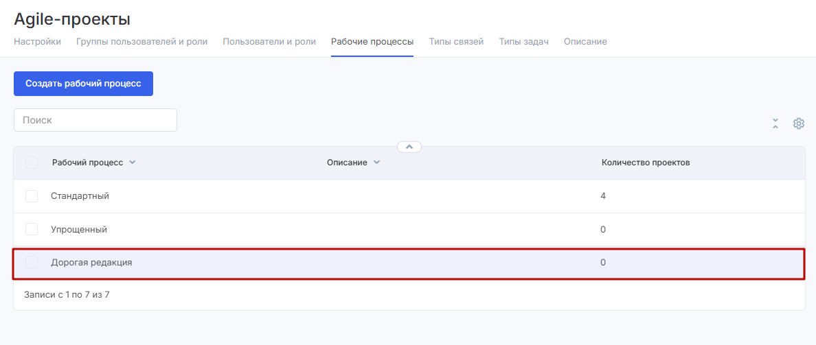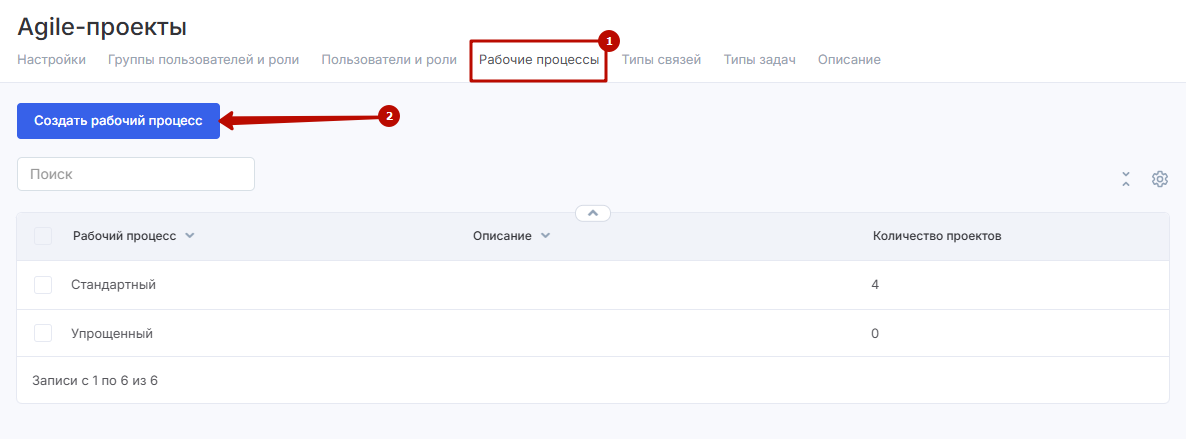 Чтобы создать рабочий процесс, откройте настройки Agile-модуля и перейдите во вкладку «Рабочие процессы» (1). Перед вами появится список уже существующих рабочих процессов с указанием количества проектов, в которых они уже задействованы. Чтобы создать рабочий процесс, нажмите на соответствующую кнопку (2).