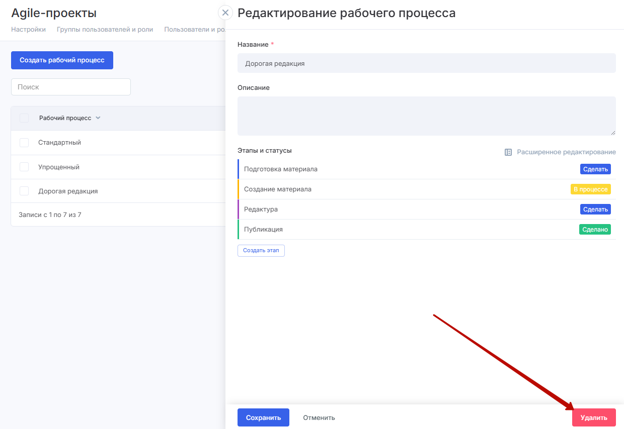 Для удаления так же откройте список рабочих процессов в настройках Agile-модуля, выберите рабочий процесс и перейдите к его редактированию.