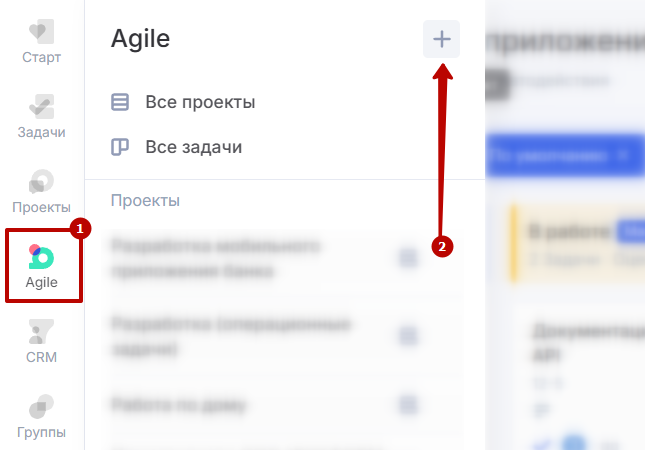 Нажмите на иконку в виде «плюса» рядом с логотипом вверху экрана (1). В появившемся контекстном меню выберите пункт «Новый Agile-проект» (2).