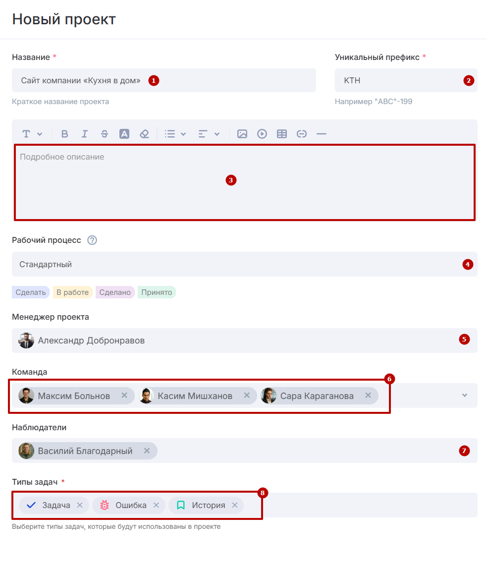 при желании укажите наблюдателей (7) — пользователей, у которых будет доступ к просмотру проекту;