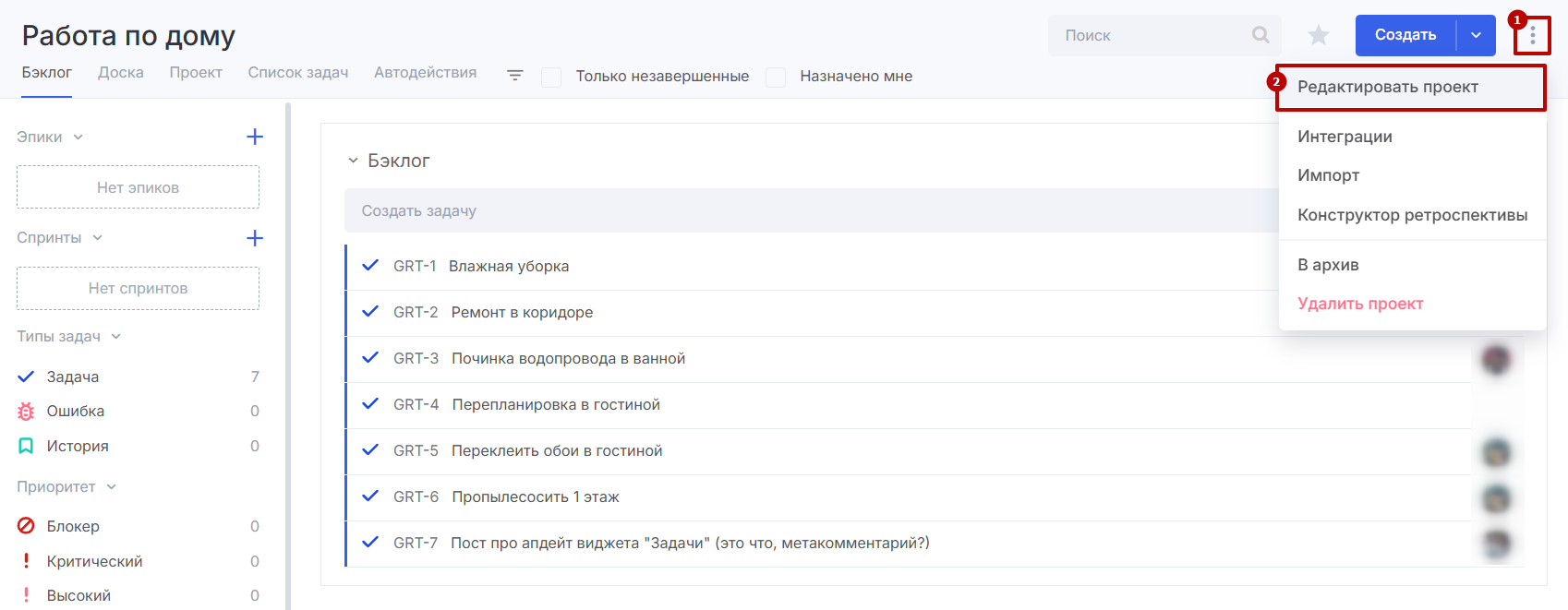 Находясь внутри самого Agile-проекта, вы сможете отредактировать его из любого экрана. Для этого просто откройте контекстное меню в правом верхнем углу (1) и выберите пункт «Редактировать проект» (2).