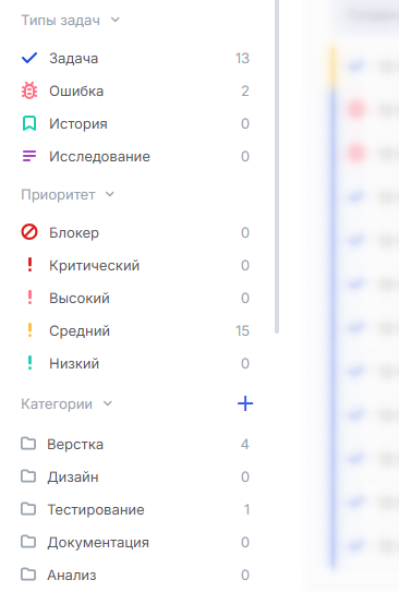 Частично бэклог схож с разделом «Планирование» в модуле «Задачи». Точно так же в левой части экрана находятся папки — для навигации по группам задач.