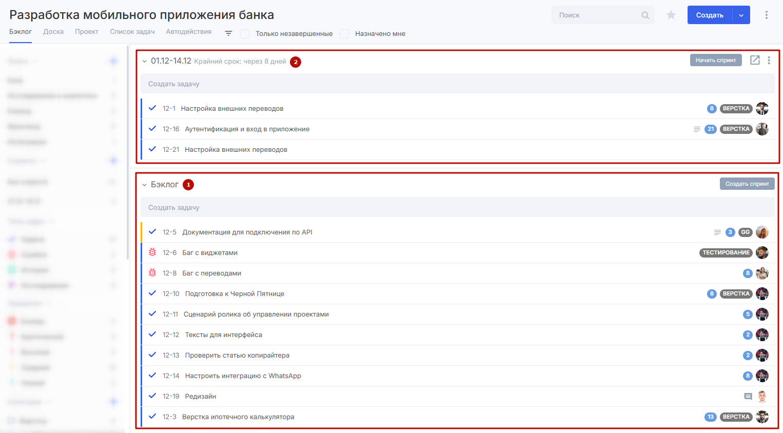 Центральная часть экрана делится на блоки — собственно «бэклог» (1) и спринты (2).