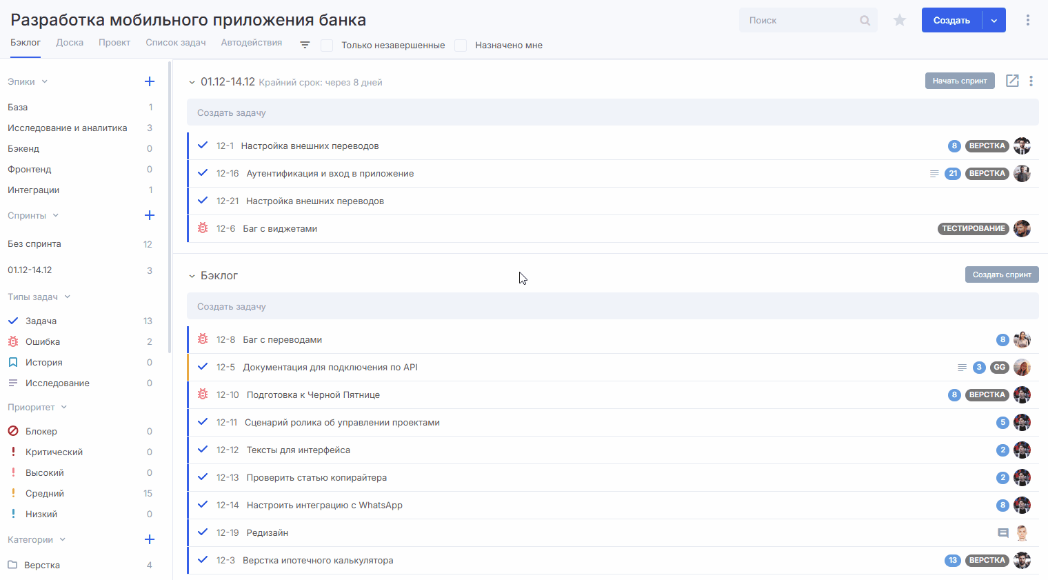 Задачи в этих блоках можно перемещать с помощью drag’n’drop — например, чтобы наполнять спринты задачами из бэклога. Вы также можете менять признаки задач — их типы, приоритетность, категории — перемещая их в соответствующую папку слева.