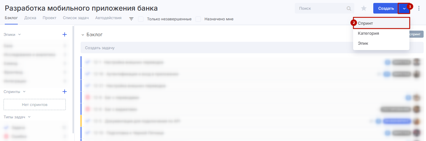 Добавить спринт можно на любой странице проекта (кроме раздела «Автодействия») с помощью стрелки рядом с кнопкой «Создать» (1) — в выпадающем меню выберите пункт «Спринт» (2).