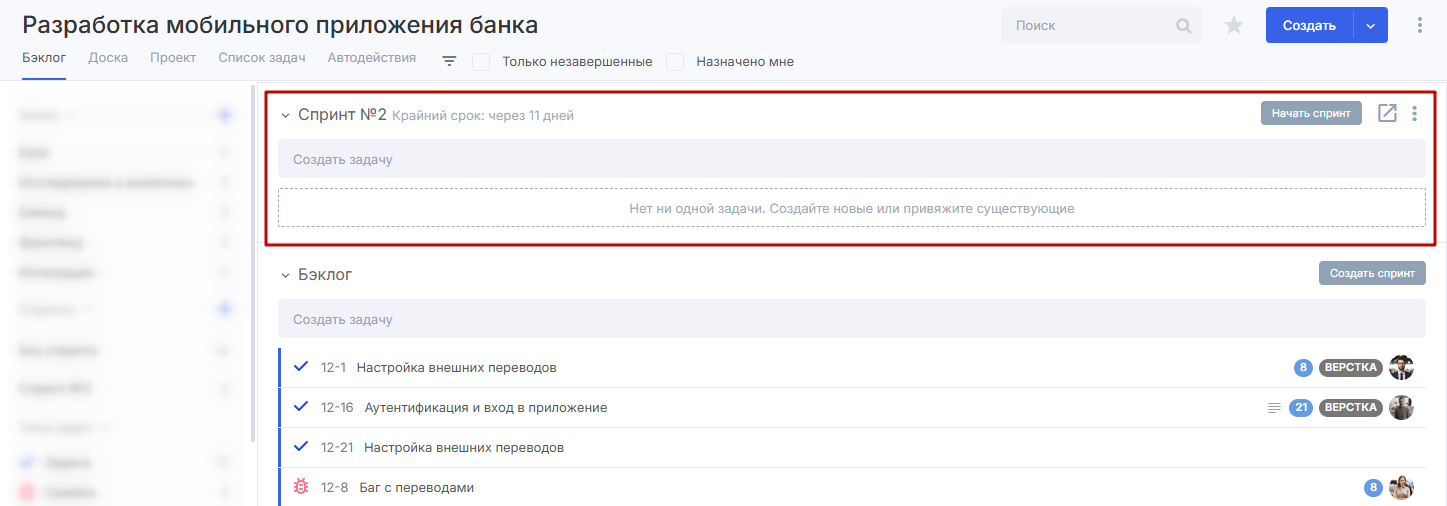 После сохранения панель созданного спринта появится перед бэклогом. Здесь же вы сможете наполнить спринт задачами.