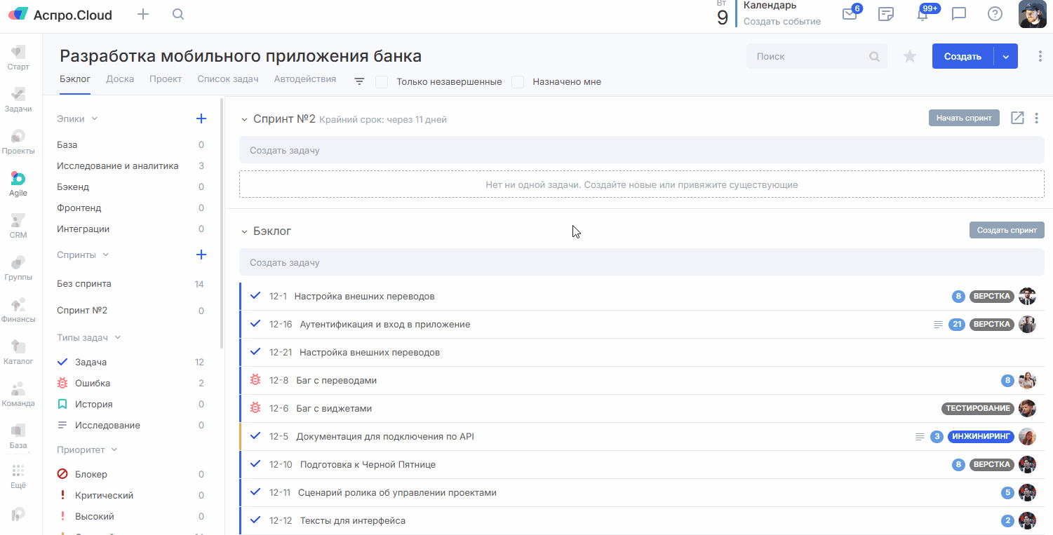 Создавать спринты в Agile-проектах могут администраторы модуля «Agile», а также менеджер проекта.