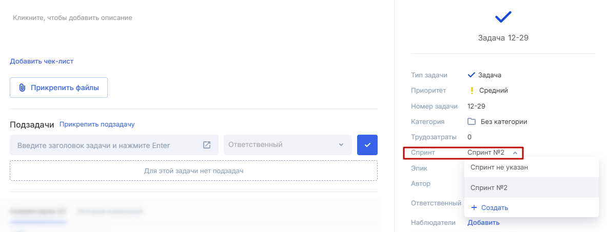 Спринты также можно привязывать к задачам непосредственно при их создании или редактировании, а также из детальной страницы задачи.