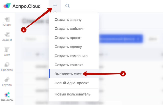 Нажмите на иконку в виде плюса в верхней панели (1). В списке выберите пункт «Выставить счет» (2).