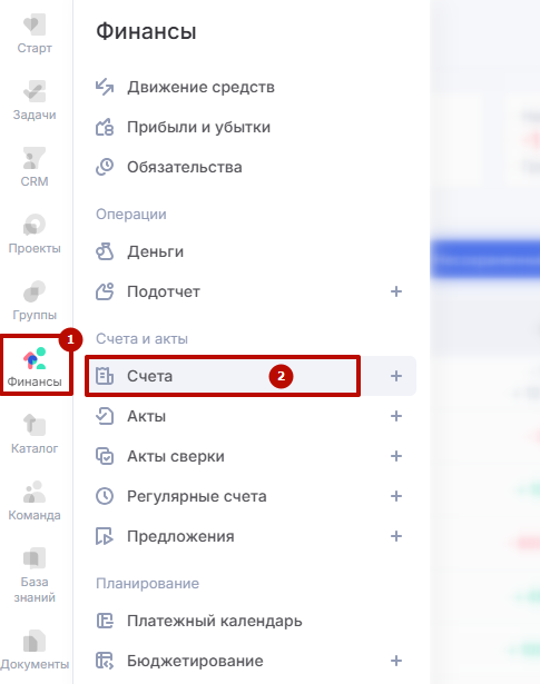 Через меню модуля «Финансы» из бокового меню (1) перейдите в подраздел «Счета» (2).