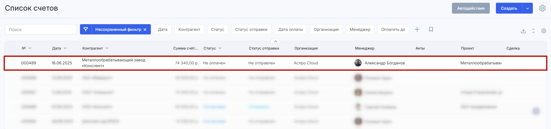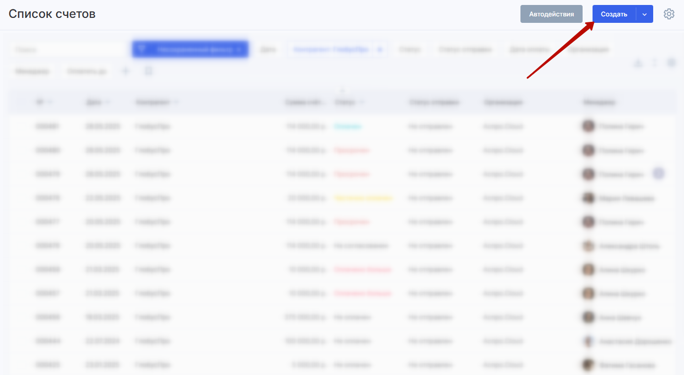 Кроме того, выставленный счет появится в списке всех счетов.