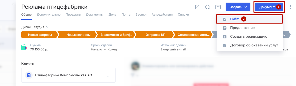 В модуле «CRM» откройте нужную сделку. Нажмите кнопку «Документ» (1) и выберите пункт «Счет» (2) из выпадающего списка.