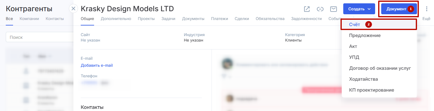 В списке в модуле «CRM» выберите карточку нужного контрагента. Нажмите кнопку «Документ» (1) и выберите пункт «Счет» (2) из выпадающего списка.