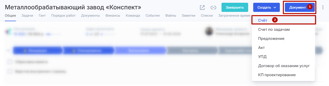 Откройте нужный проект. Нажмите кнопку «Документ» (1) и выберите пункт «Счет» (2) из выпадающего списка.