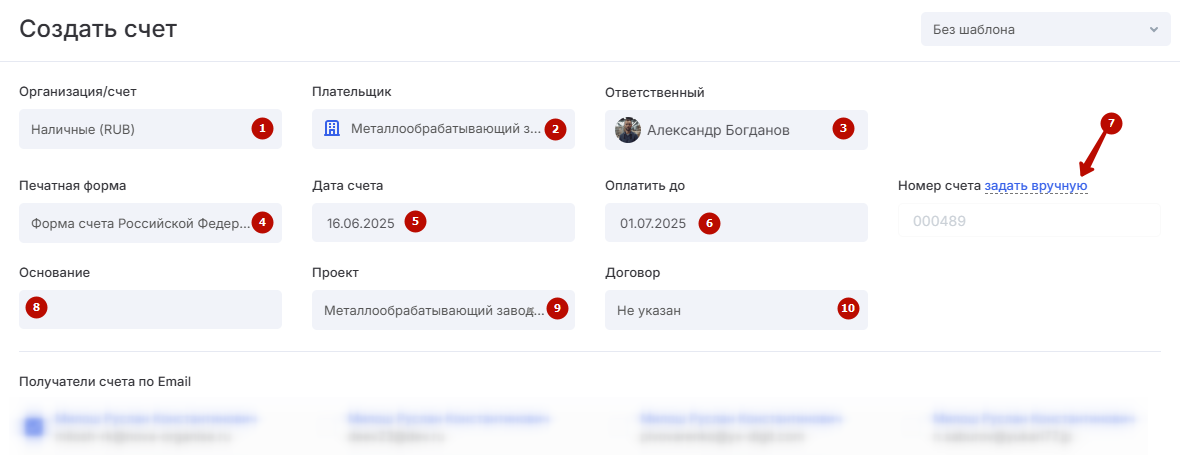номер счета — при необходимости можно выставить вручную (7);
