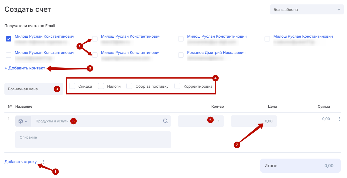 - выберите получателей счета (1) — по умолчанию в форму подгружаются все контакты указанного контрагента; при необходимости добавьте новый контакт (2);
