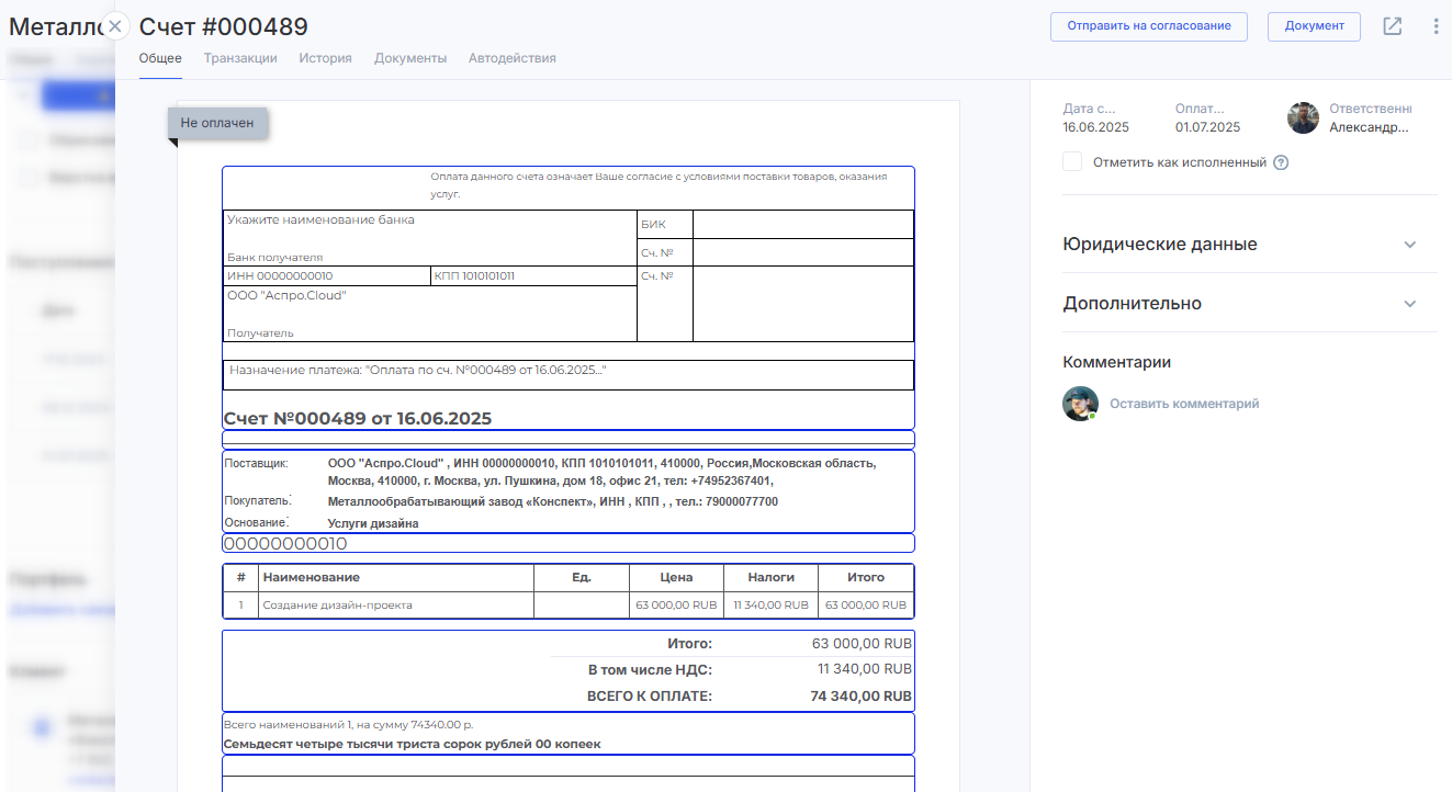 выберите ответственного (3) — менеджера, который выставляет счет и/или следит за его оплатой;